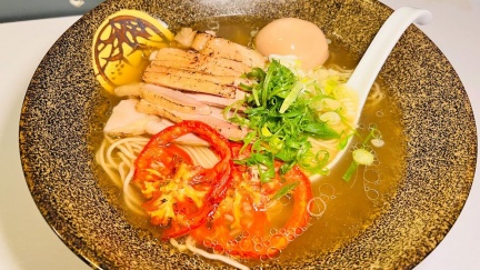 醬油雞清湯拉麵:在雞湯基底中加入醬油風味調和,使湯頭帶有鹹香層次。湯頭比純鹽味版本有更多厚度與鹹度,但仍保有雞湯的清爽感。配料類似,以雞肉、蔬菜、細麵為主。