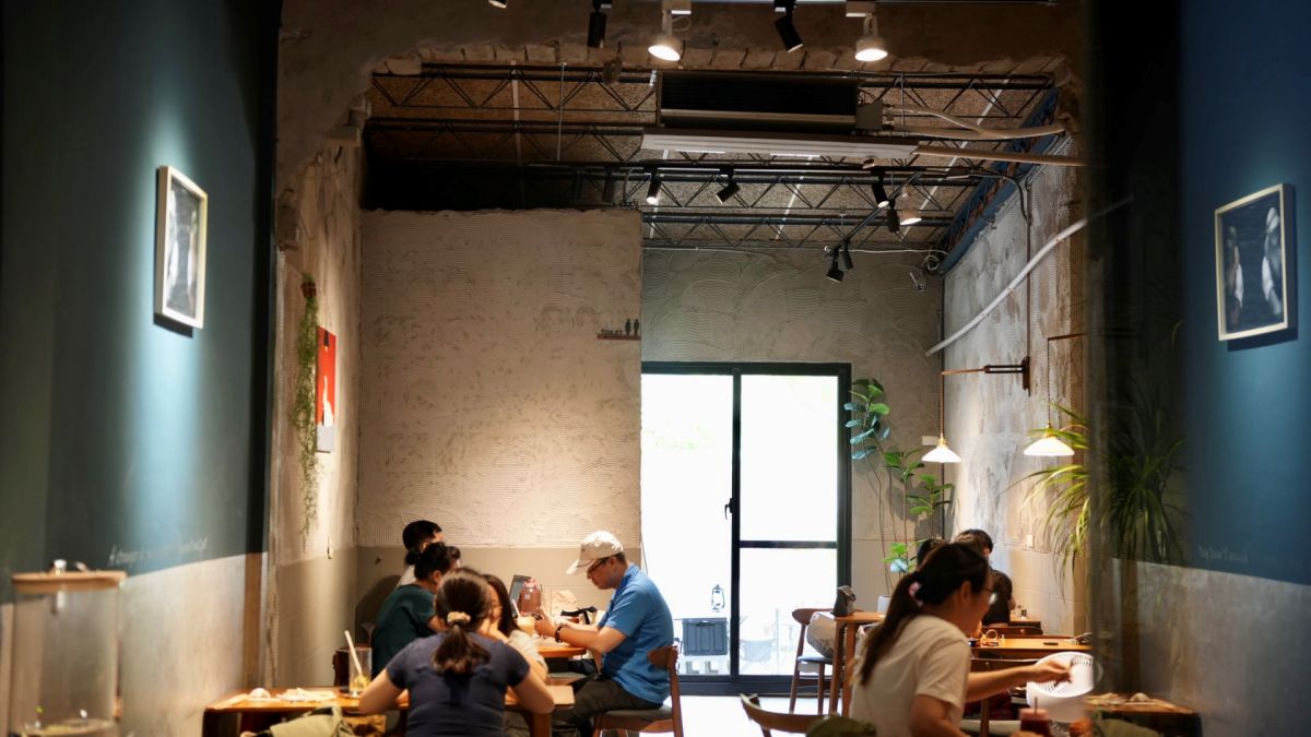 ▲店面外觀保有些許斑駁感、舊牆皮與裸露水泥的工業風格交錯,搭配暖色灯光與簡約木質家具。(圖片來源:小米食)