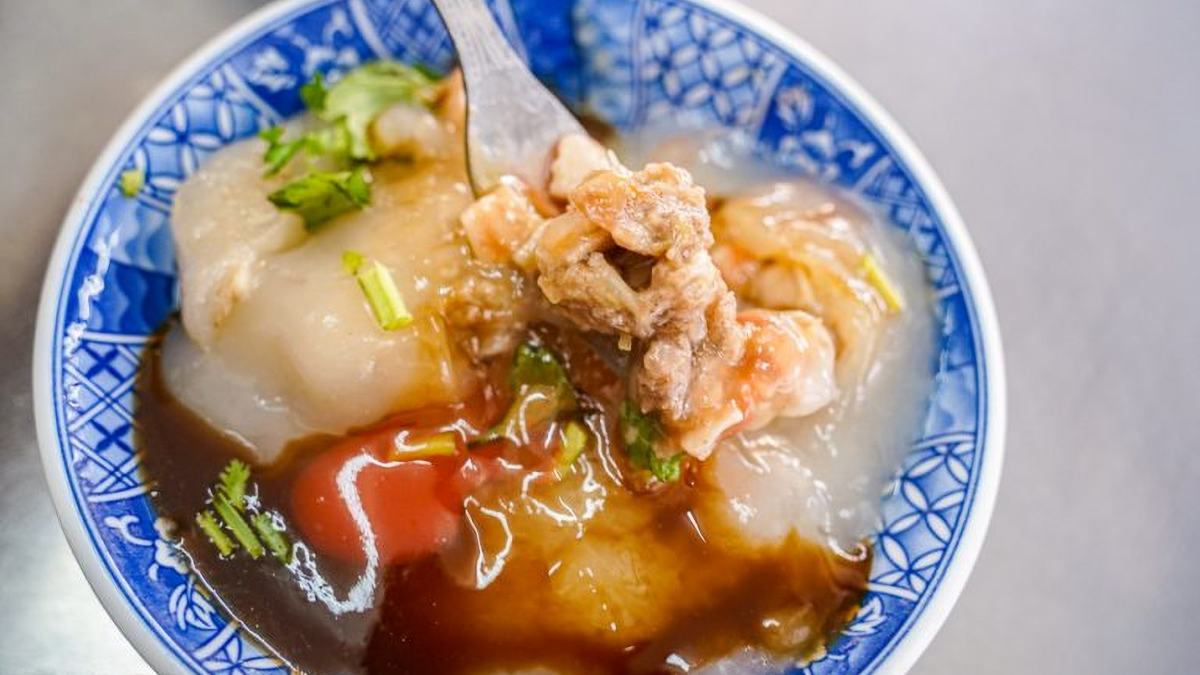 碗粿以在來米漿蒸製,拌入埔里香菇,中間包一顆醃製大肉丸是靈魂;上桌前會先切去一角,再淋特調蒜蓉醬油與花生粉,口感綿彈、米香十足,肉丸帶古早五香調性,與醬香非常下飯。配一碗竹筍湯清甜脆口,或來份少見的桂圓糯米粥(冰),紅糖、枸杞與桂圓熬到米粒開花、冰涼不膩;現場吃熱碗粿暖胃、外帶也有冷碗粿版本可選。