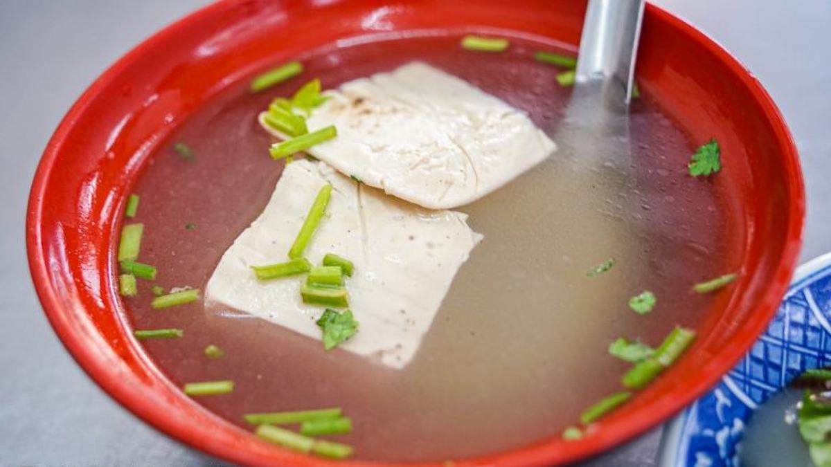 這裡的吃法有員林招牌特色:剪開肉圓後,淋上白色米漿與特製油膏,再撒香菜提味;外皮走先蒸後炸路線,口感軟糯帶Q、一拉就看得出彈性。內餡以碎瘦肉與筍丁為主,鹹度不重、重在鮮甜與醬香相襯;不少老饕會加一點辣醬更帶勁。想配一碗湯,豆腐湯是清甜的大骨基底,撒胡椒與香菜後更順口——簡單卻耐吃,完整呈現員林肉圓的樸實風味。